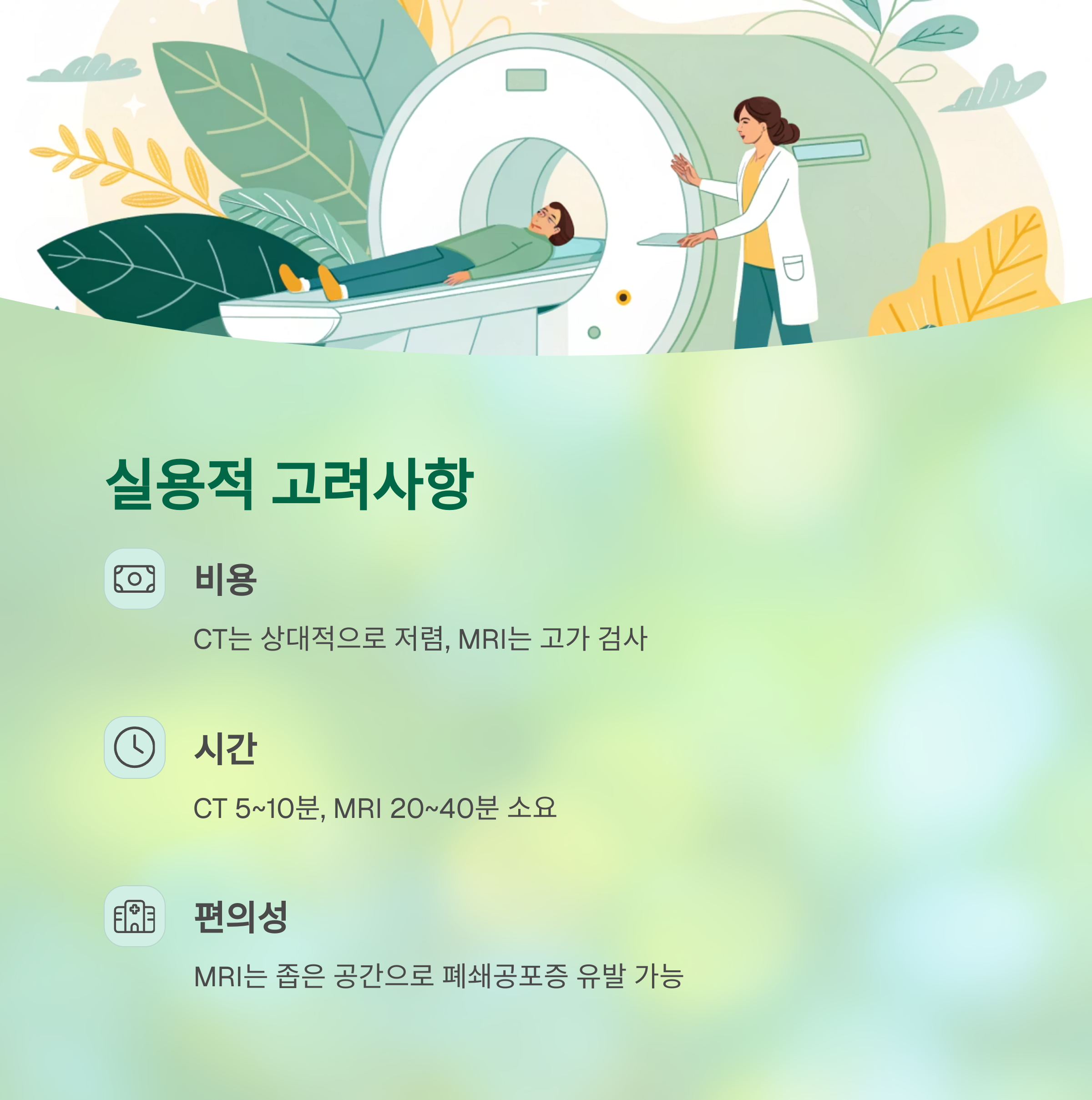 MRI는 촬영 시간이 길지만 정밀 진단, 만성질환, 미세 병변 확인에 강합니다