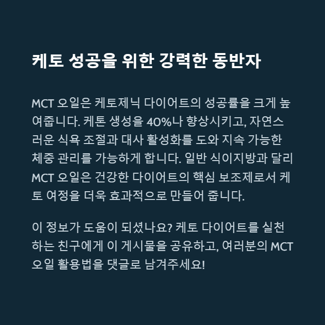 MCT 오일을 알고 나서 케토 다이어트는 더 이상 어렵지 않았어요. 그냥 한 스푼 추가했을 뿐인데, 에너지도 더 나고 배고픔도 덜하고 무엇보다 체지방이 확 줄더라고요! 다이어트 중 정체기가 오셨다면, MCT 오일 한 번 시도해 보세요. 작은 변화가 큰 결과를 만들어줄지도 몰라요. 여러분의 경험이나 궁금한 점도 댓글로 나눠주시면 같이 이야기해 봐요!
