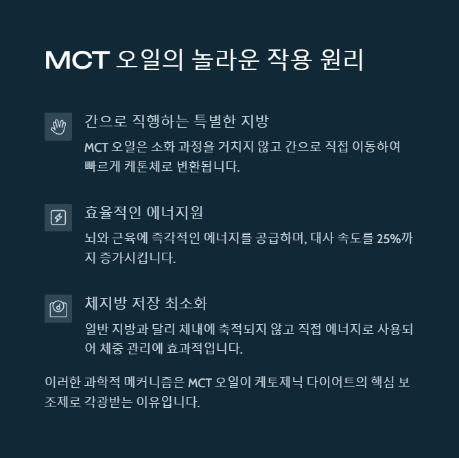 | 섭취 직후 | 소화기관에서 바로 간으로 이동 | 체내 당보다 MCT 우선 사용 |